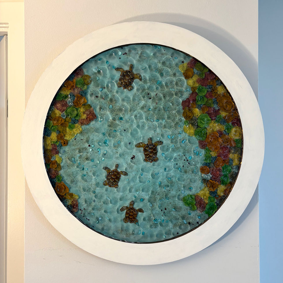 A vibrant coral reef comes to life in this circular piece, where four turtles glide through a richly textured underwater landscape. Each element is hand-sculpted, creating depth, movement, and intricate detail. As light shifts across the surface, the reef reveals layers of color and energy, evoking the quiet rhythm and vitality of life beneath the sea.